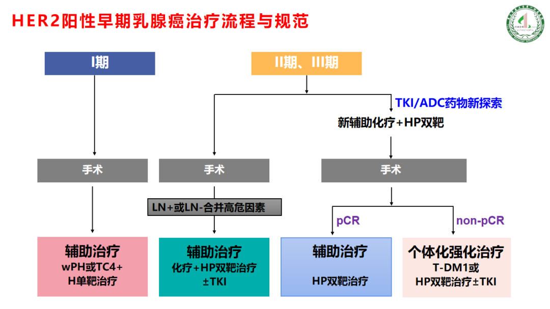 HER2阳性早期乳腺癌治疗流程与规范:绝大多数的Ⅱ期、Ⅲ期患者需要进行新辅助化疗和HP双靶,或者联合TKI/ADC药物来治疗,pCR的患者继续沿用之前的靶向治疗方案,non-pCR的患者需要进行个体化的强化治疗,T-DM1为优选,在T-DM1不可及的情况下,HP双靶或者序贯TKI的治疗方案也是很好的可选策略;针对Ⅱ、Ⅲ期直接手术的患者,手术之后要评估危险度,对于LN+或者LN-合并高危因素的患者还是要进行化疗+HP双靶治疗±TKI;对于Ⅰ期直接手术的患者,术后要进行wPH或TC4+H单靶治疗。