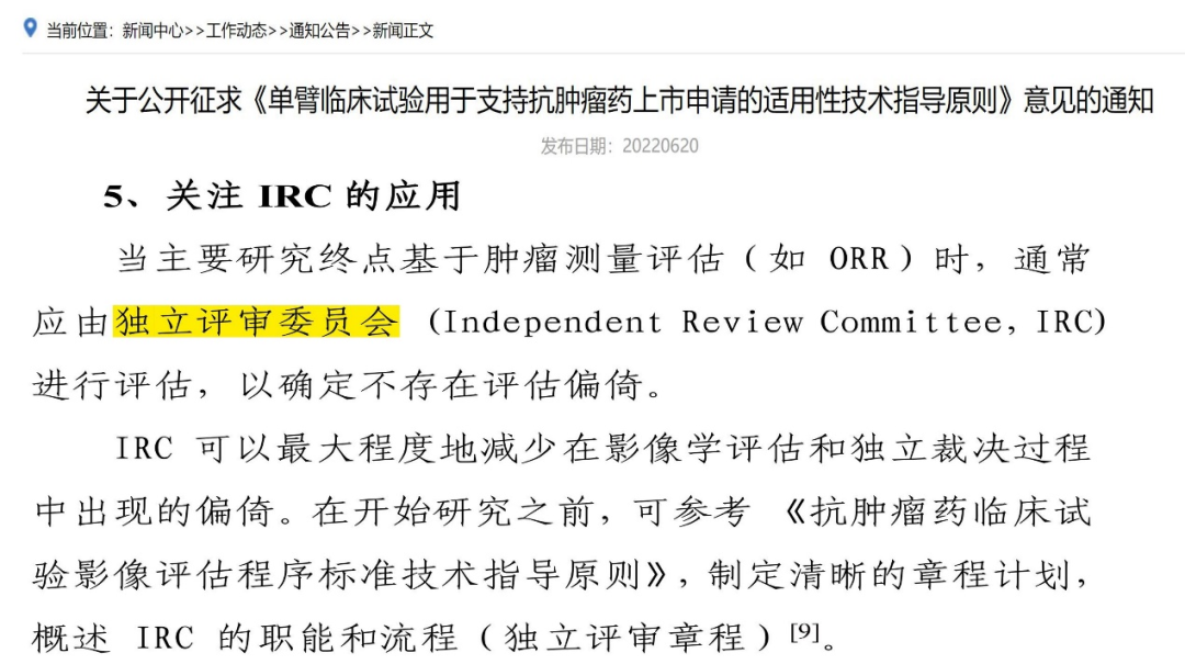 此外,从药物研发政策的角度看,“以独立评审委员会评估的疗效为主”也是相关政策的要求。2022年6月20日,国家药监局新药审评中心发布了《单臂临床研究用于支持抗肿瘤药上市申请的适用性技术指导原则(征求意见稿)》,该指导文件明确提出,对于单臂临床研究,应当尤其关注并重视独立评审委员会评估的结果而非研究者评估的结果。