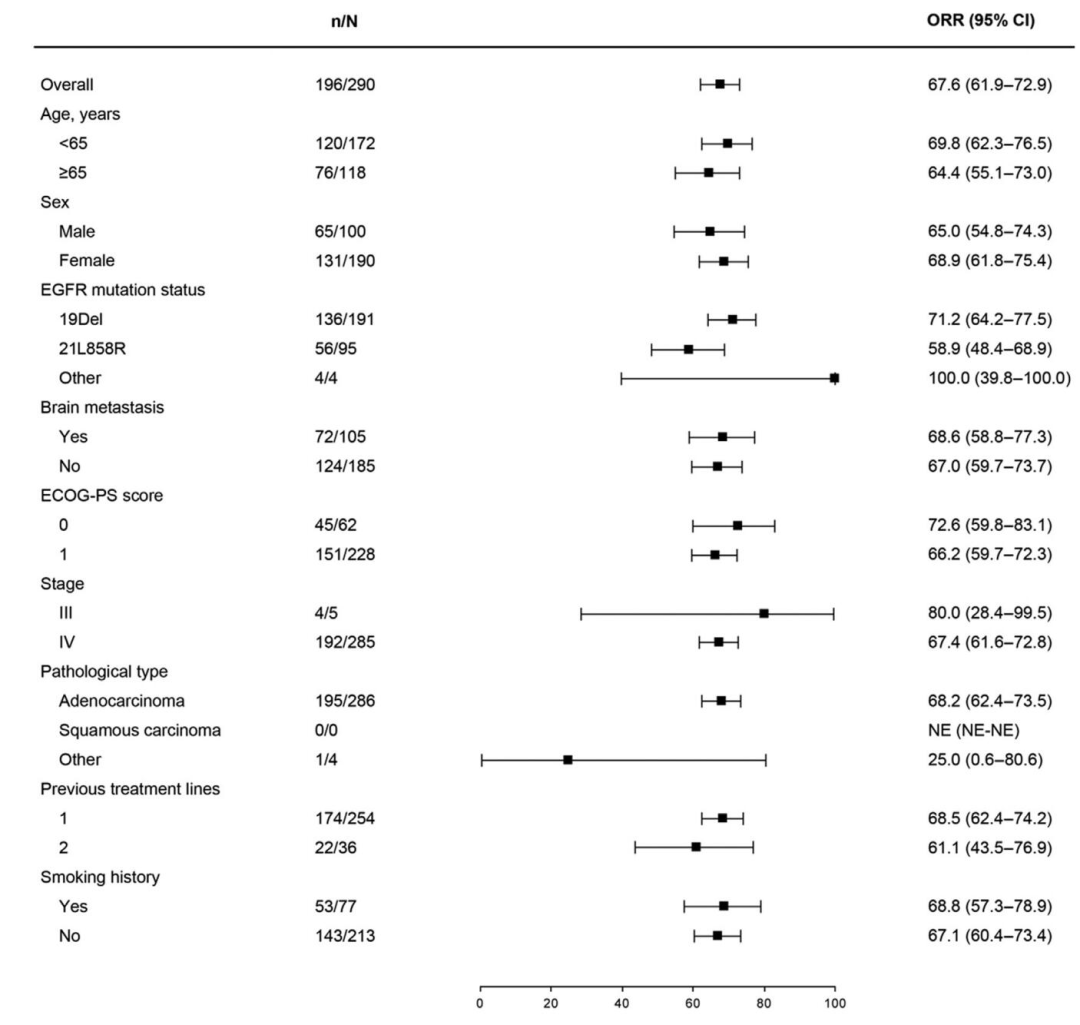 对于几个关键的亚组,贝福替尼同样展示了良好的疗效。对于75 mg升至100mg剂量的患者而言,即使患者既往接受过一线或二线治疗,患者接受贝福替尼治疗的ORR仍然可以达到68.5%和61.1%;携带19 del的患者,获益更多,ORR为71.2%,携带21 L858R突变的患者,ORR为58.9%。性别并不影响患者的获益,男性和女性接受治疗后的ORR分别为65%和68.9%。