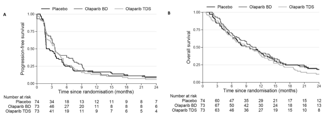 数据分析时,中位随访时间37个月,38%的患者未出现疾病转移,中位年龄为64岁,男性占比46%,1%的患者入组时存在脑转移,90%的患者接受含铂双药化疗时存在客观响应。奥拉帕利每日两次、每日三次及安慰剂组的中位PFS分别为3.7个月、3.6个月和2.5个月,与安慰剂组相比分别为HR=0.76和HR=0.86,P=0.18和P=0.16,差异无统计学意义。但敏感性分析将5例诱导治疗后出现疾病进展,实际不符合入组标准的患者排除后,奥拉帕利每日两次与安慰剂组相比,差异有统计学意义,HR=0.69,P=0.043。4个月的PFS率在奥拉帕利组均为45%,安慰剂组为36%。OS的差异无统计学意义。奥拉帕利每日两次、每日三次及安慰剂组6个月OS率分别为69%、66%和66%。