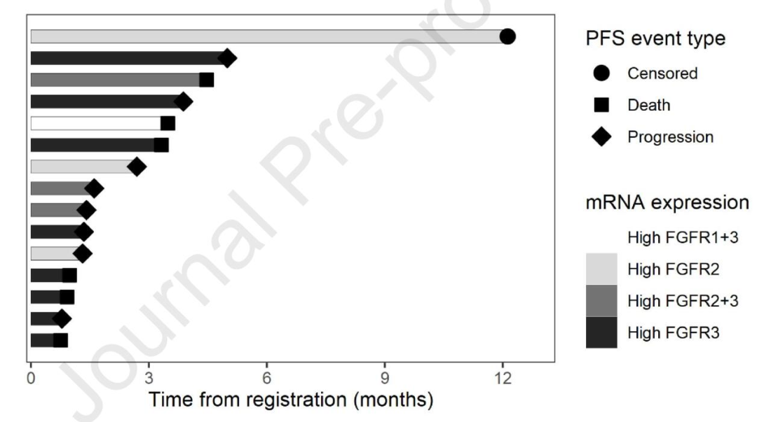 该研究中,共计49例患者接受筛查,20例患者阳性,15例患者入组,FGFR1/2/3的mRNA高表达的患者分别有1例、6例和12例患者。前10例患者入组后,仅有1例患者达到了6个月时疾病仍然未进展,研究被提前终止,15例患者6个月的PFS率为6.7%,中位PFS仅为1.6个月,中位OS仅为3.5个月。从安全性看,全组3度及以上治疗相关不良反应为33%,无治疗相关的死亡事件出现,1例患者因治疗相关的不良反应而导致治疗终止,另有60%的患者因不良反应而导致剂量下调,另有60%的患者出现严重不良反应。