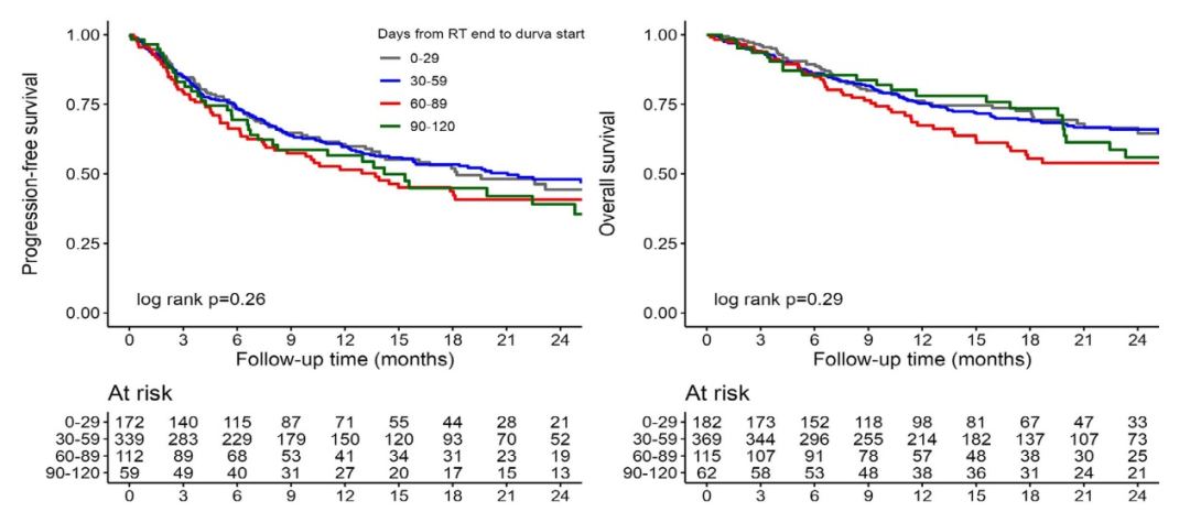 在该研究中,中位度伐利尤单抗治疗起始时间为41天,研究者以0~29天、30~59天、60~89天,90~120天为4个时间节点,中位随访时间17.6个月,并未发现免疫治疗起始时间与患者的PFS (P=0.26)及OS (P=0.29)有关。