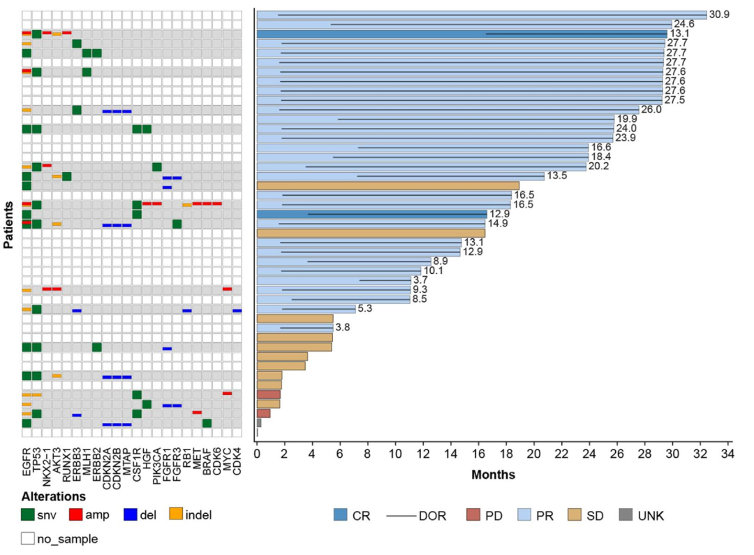 最终,该研究共入组45例患者接受至少一次的Nazartinib治疗。中位随访时间30个月,数据分析时,42%的患者治疗终止,另有42%的患者基线存在脑转移。独立评审委员会评估的ORR和DCR分别为69%和91%,中位DOR为25个月。PFS和OS的中位随访时间分别为17个月和25个月,中位PFS和中位OS分别为18个月和未达到,33个月的OS率为56%。19例有脑转移的患者中,18例患者有至少一次治疗后的疗效评估,两例既往接受过脑放疗。这部分患者的ORR为67%,中位DOR为15个月,中位PFS为17个月。7%的患者因不良反应而导致治疗终止,另有40%的患者出现严重不良反应。
