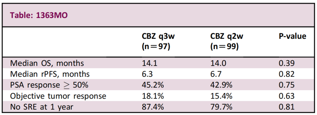 这项3期CABASTY研究旨在探讨更适合老年人、毒性更小的卡巴他赛方案。研究共入组196例老年患者(中位年龄74岁,≥70岁占79.6%;G8<14占19.9%,86.7%接受过ART治疗),随机分为两组:卡巴他赛3周方案(25 mg/m2,q3w)和2周方案(16 mg/m2,q2w);后者具有“密集性、低剂量”化疗特点;两组均联合激素和集落刺激因子(G-CSP)治疗。