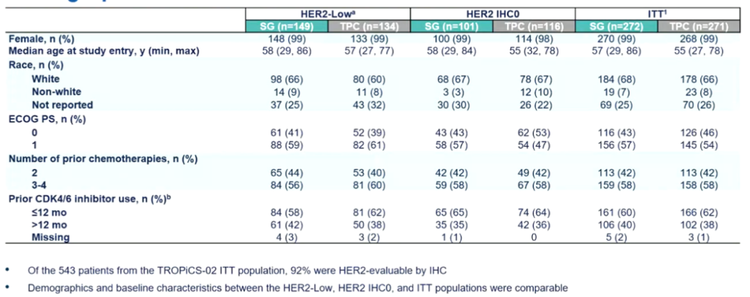 研究结果:在意向治疗(ITT)人群和每个治疗组中,92%的患者为HER2 IHC 0或HER2-Low。HER2 IHC 0和HER2-Low之间的基线特征与ITT人群的基线特征相似。