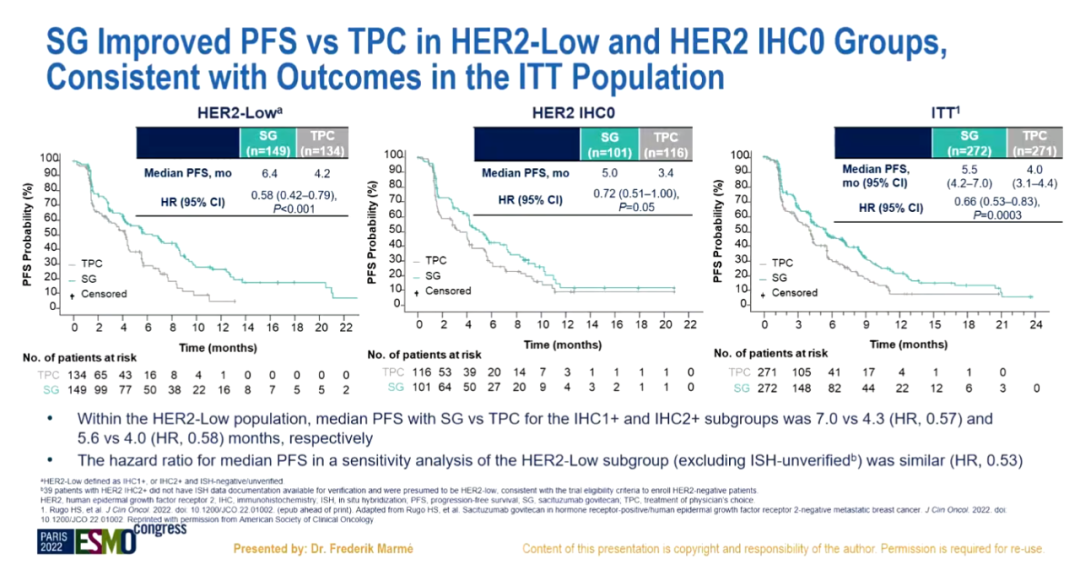 在HER2 IHC0和HER2-Low组中,与TPC组相比,SG组中位PFS均改善(HR 0.72,P=0.05和HR 0.58,P<0.001);在HER2-Low组中,SG组与TPC组相比,中位PFS在IHC1+和IHC2+分别为7.0 vs 4.3个月(HR 0.57)和5.6 vs 4.0个月(HR 0.58)。