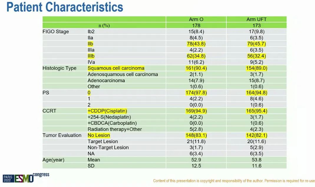 1. Fujiwara K, Nishio S, Yamamoto K, et al. Randomized phase III trial of maintenance chemotherapy with tegafur-uracil versus observation following concurrent chemoradiotherapy for locally advanced cervical cancer, GOTIC-002 LUFT trial. Presented at: ESMO Congress; September 9-13, 2022. Paris, France and virtual. Abstract LBA31.