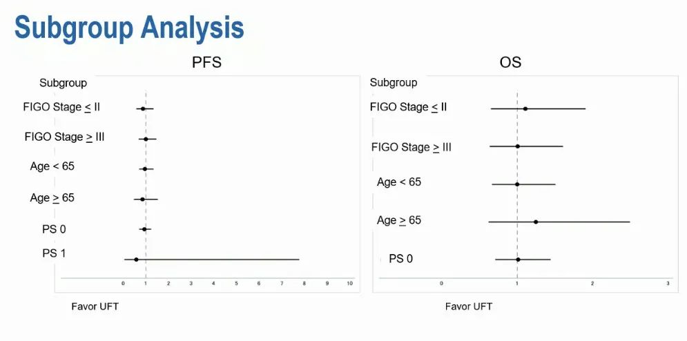 观察组的5年OS率为77.6%(90%CI: 71.8-82.4),UFT组为76.1%(90%CI: 70.1-81.1)(HR=1.04,90% CI: 0.73-1.47;p=0.869)。PFS和OS亚组分析显示,大多数亚组的患者没能从UFT维持治疗中获益。