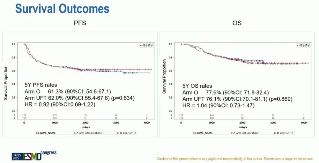 患者的中位PFS未达到。观察组的5年PFS率为61.3%(90% CI: 54.8-67.1),UFT组为62.0%(90% CI: 55.4-67.8)(HR=0.92,90%CI: 0.69-1.22;p=0.634)。