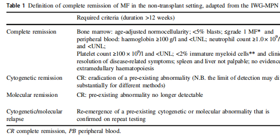 在非移植环境中,MF患者的完全缓解(CR)是指:①在骨髓活检中原始细胞比例<5%,根据欧洲分级系统(目前的WHO纤维化评分)≤1级;②外周血计数标准达到血红蛋白(HB)≥100g/L、中性粒细胞计数(ANC)≥1.0×109/L及血小板≥100×109/L;血涂片上未成熟髓细胞比例<2%(脾切除患者未成熟髓细胞<5%)。③临床症状缓解,脾或肝肋下未能触及,没有髓外造血的证据,详见下表1。