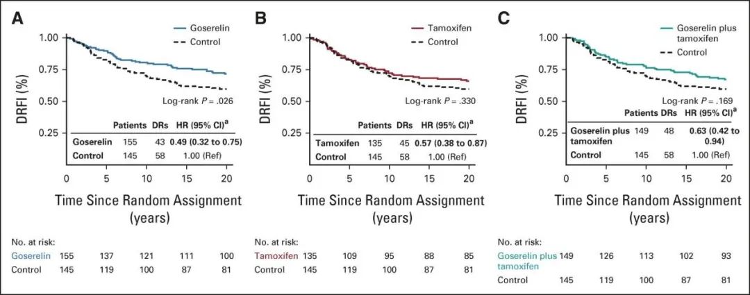 结果:在雌激素受体阳性患者群体中(n=584,中位年龄47岁),戈舍瑞林、他莫昔芬和联合用药相对于对照组的长期无远处复发间隔有显著改善(多变量风险比<hr/>,0.49;95%CI,0.32到0.75,HR,0.57;95%CI,0.38到0.87,HR,0.63;95%CI,0.42到0.94)。戈舍瑞林和他莫昔芬有显著的相互作用(P=0.016)。基因组低风险患者(n=305)显著受益于他莫昔芬(HR,0.24;95%CI,0.10至0.60),基因组高风险患者(n=158)显著受益于戈舍瑞林(HR,0.24;95%CI,0.10至0.54)。在基因组高风险患者中,戈舍瑞林治疗中添加他莫昔芬会增加风险(HR,3.36;95%CI,1.39至8.07)。此外,基因组低风险患者对他莫昔芬有20年的长期持续获益,而基因组高风险患者对戈舍瑞林仅有早期获益。