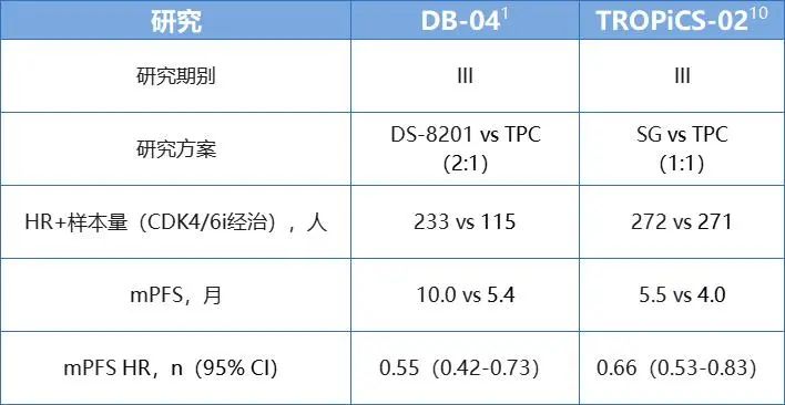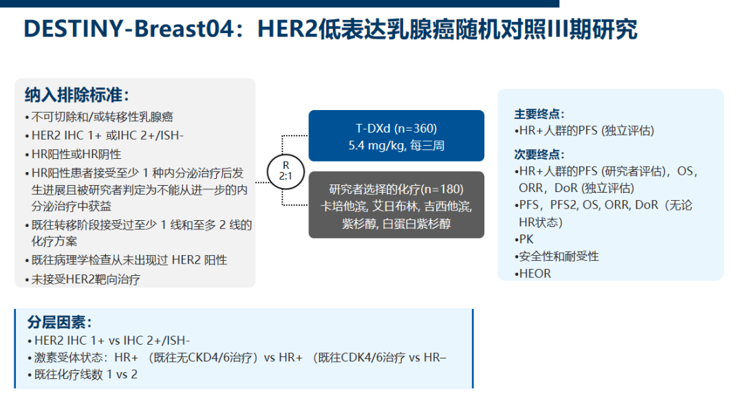 DB-04是一项全球多中心、随机、开放性III期研究,评估DS-8201(5.4 mg/kg)对比医生选择的化疗(TPC)(卡培他滨、艾立布林、吉西他滨、紫杉醇或白蛋白结合型紫杉醇)治疗既往接受过一线或二线化疗的HR阳性(n=480)或HR阴性(n=60)HER2低表达不可切除和/或转移性乳腺癌(MBC)患者。患者以2:1的比例随机接受DS-8201或TPC。主要研究终点为HR+人群的PFS(BICR评估)。分层因素为:①HER2 IHC1+vs IHC 2+/ISH-;②激素受体状态:HR+(既往未经过CDK4/6抑制剂治疗vs既往CDK4/6抑制剂经治)vs HR-);③既往化疗线数1 vs 2。