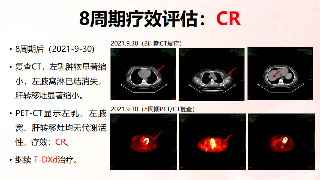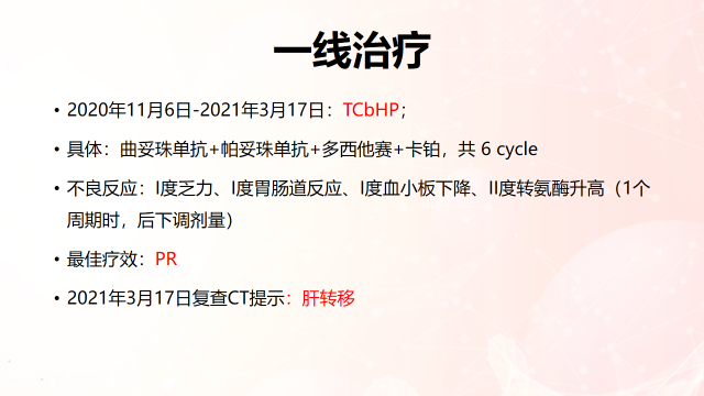 王殊教授:这是一个开放性问题,目前没有标准答案。患者之前的治疗都是用的大分子药物,无论是ADC药物,还是曲帕双靶联合化疗,所以如果没有其他靶点,还要继续在抗HER2的道路上走下去的话,我会加上TKI药物。当然如果有其他新型的ADC药物或新的靶点药物可供选择的情况下,那将是一个更精准的指引,在当前没有新的ADC和靶点的情况下,我会把TKI加上。