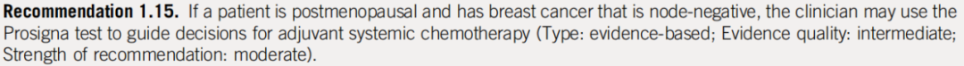 根据TAILORx研究和RxPONDER研究,指南对Oncotype Dx进行了更新,推荐其在绝经后患者(N0或N1-3)的使用,同时额外推荐其在绝经前淋巴结阴性患者的使用。