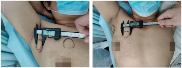 2、辅助放疗:2022.11.29开始辅助放疗,放疗靶区:右侧胸壁+內乳+锁骨上,放疗剂量:50Gy/25Fx。