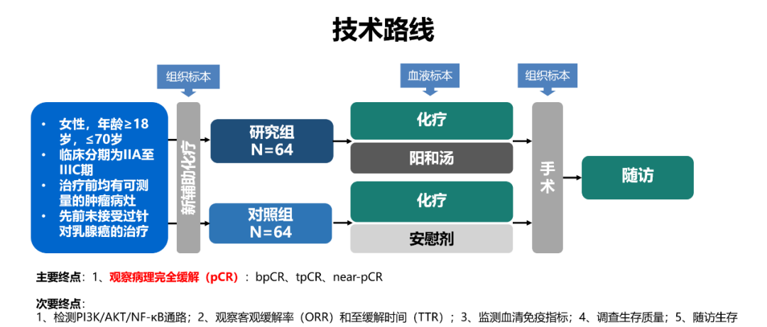 制定新辅助方案:TCbHPq3w×6次,同时患者签署知情同意书后入组我科《阳和汤改善乳腺癌新辅助化疗疗效及免疫功能的临床研究》课题:于新辅助化疗期间加用阳和汤药物干预,中药覆盖NAC全周期,观察对NAC期间病理完全缓解率及对患者免疫功能的影响。