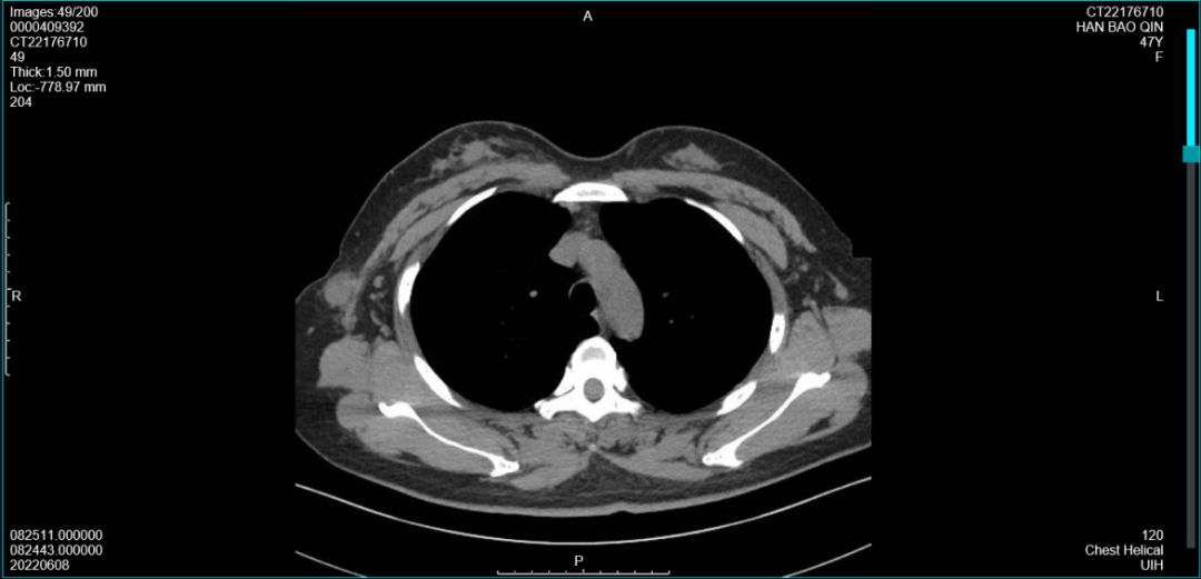 2021年7月14日胸部CT:双肺(-)。未扫及右乳肿块,右腋窝可见数个淋巴结(最大19×17mm)