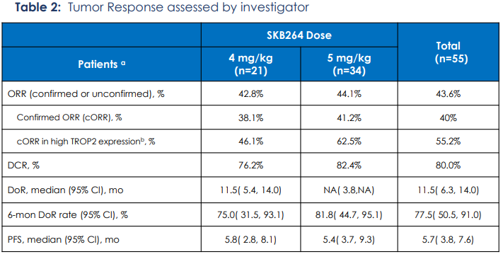疗效:在55例可进行疗效评估的患者(4mg/kg组21例,5mg/kg组34例)中,确认的客观缓解率(ORR)为40%,疾病控制率(DCR)为80%,其中TROP2高表达患者确认的ORR为55.2%,TROP2高表达5mg/kg剂量组确认的ORR高达62.5%。中位持续缓解时间(DoR)为11.5个月,中位无进展生存期(mPFS)为5.7个月,中位总生存期(mOS)为14.6个月,12个月OS率为66.4%。