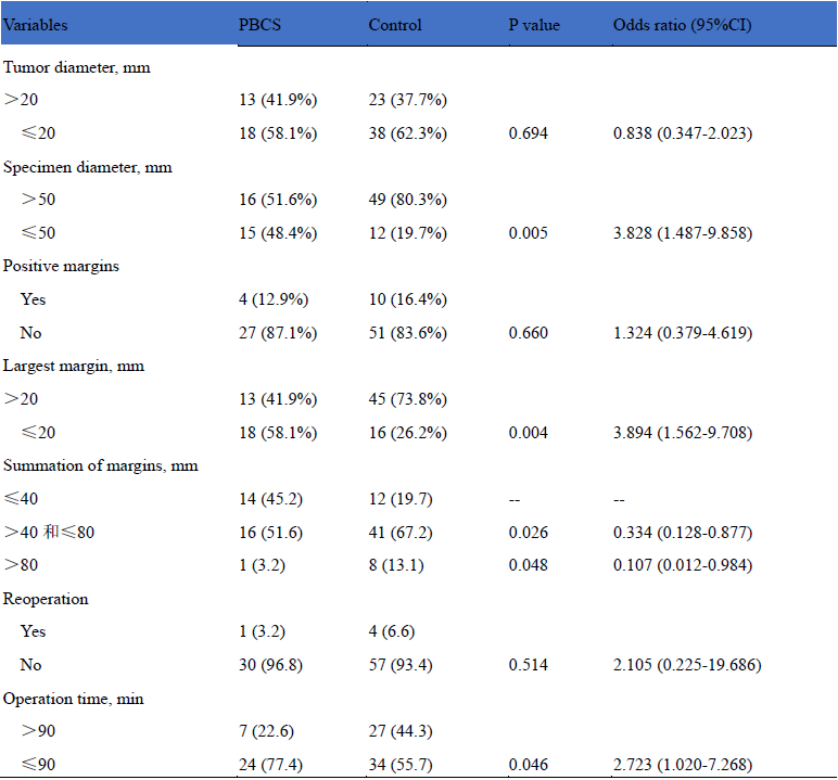 相较于常规保乳手术组,精准保乳手术组标本直径>50mm的病例数更少(P=0.005),最长切缘>20mm的病例数更少(P=0.004),定位切缘和≤40mm的病例数更多(P<0.05),手术时长≤90min的病例数更多(P=0.046)(表2)。同时,精准保乳手术不影响切缘阳性率及二次手术率。