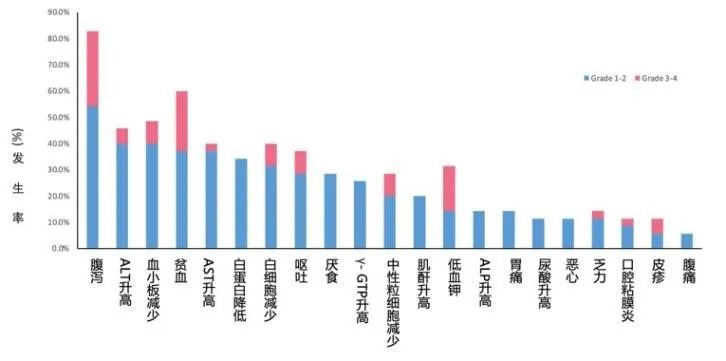 在安全性方面,97.1%(34/35)的患者发生了与治疗相关的不良反应,其中最常见的为腹泻和血小板减少。3级以上最常见的不良反应为腹泻(28.6%)、贫血(22.9%)、低血钾(17.1%)。没有4级及以上的不良反应发生。