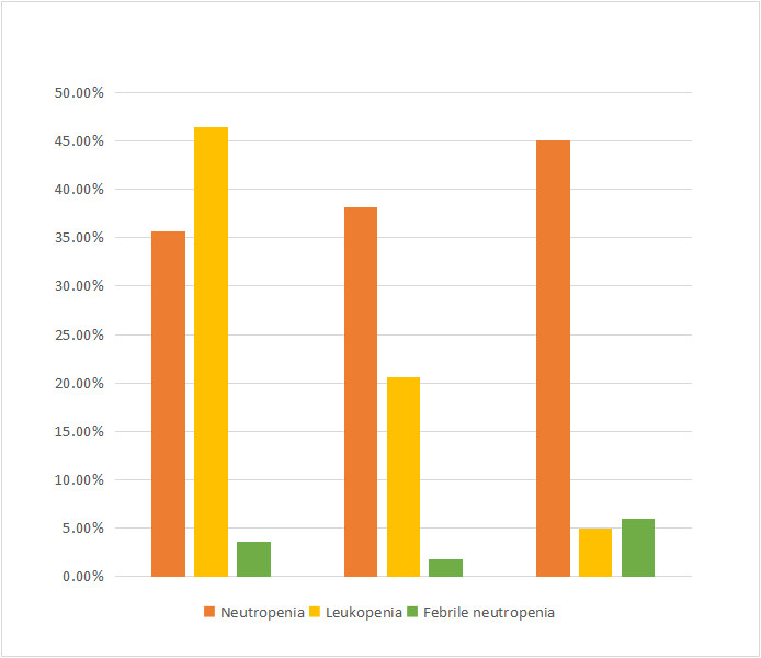 白细胞减少和中性粒细胞减少是最常见的不良事件,发生率分别为82.1%和75.0%,同时也属于3级及以上不良事件中最常见事件,发生率分别为46.4%、35.7%。