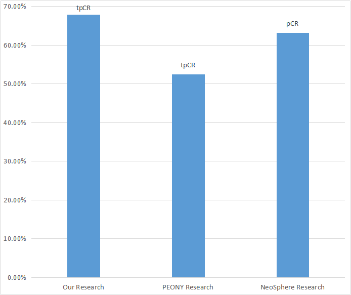 从2021年4月16日到2022年2月11日,共有28名患者成功入组。中位年龄为51.5岁(28-74岁),平均年龄为49岁,全部为浸润性癌(非特殊类型)。所有患者均完成四个周期的新辅助治疗,并接受了手术治疗。在28名患者中,有19例达到了tpCR,tpCR率为67.9%,高于NeoSphere试验中63.2%的pCR率以及PEONY研究中52.5%的tpCR率。