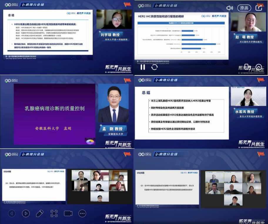 随着目前对HER2不同表达的患者有不同的治疗策略,对于检测方法的准确性和判读的一致性要求越来越高,而目前HER2检测技术对极低HER2表达敏感性不高。郑州大学第一附属医院刘宇琼教授就HER2低表达带给病理的实践挑战进行了分析,河北医科大学第四医院赵萌教授针对中国乳腺癌HER2低表达检测现状及对策提出了自己的意见。专家们在复旦大学附属肿瘤医院杨文涛教授和北京大学肿瘤医院薛卫成教授的主持下就HER2新标准,新实践进行了讨论。安徽医科大学附属第一附属医院孟刚教授结合自己的经验,就乳腺癌病理诊断的质控管理体系进行了讲解。复旦大学附属肿瘤医院水若鸿教授通过对2022年上海市乳腺癌HER2免疫组化室间质评介绍了对HER2低表达检测质控的考察流程。