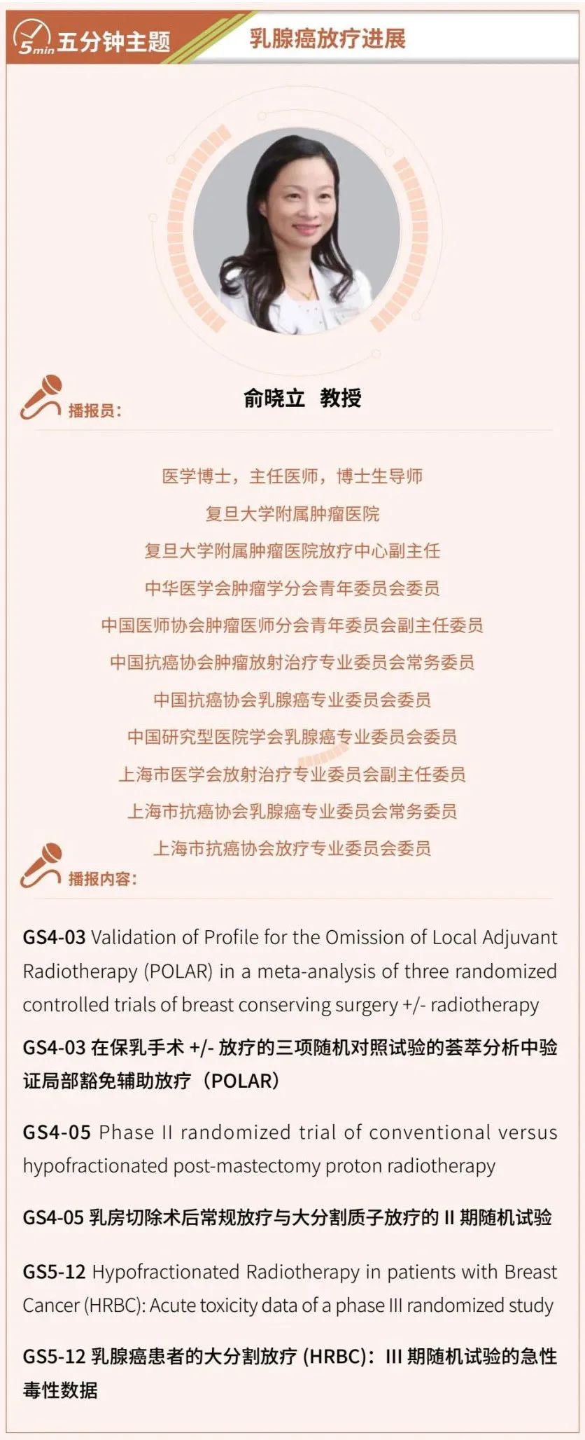 编者按:乳腺癌根治术及保乳术后高危复发患者需要进行乳腺、胸壁或区域淋巴结的放射治疗。术后放疗不但可以降低乳腺癌的局部复发率,同时也改善了患者的生存。目前,乳腺癌放疗正走在更加精准的路上,近期研究探索了放疗的分割方式及最佳剂量,并利用基因工具精准定位放疗获益人群。《肿瘤瞭望》特邀复旦大学附属肿瘤医院俞晓立教授对2022年SABCS大会中的乳腺癌放疗研究进展进行汇报。