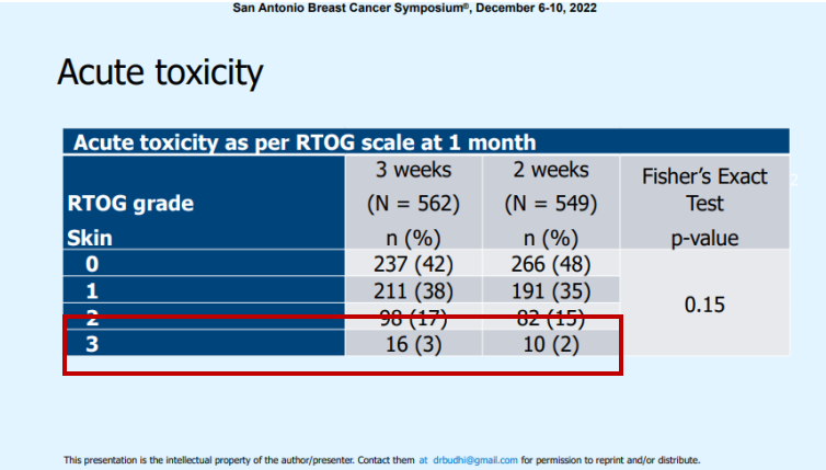 对毒性反应的研究发现,三周大分割治疗的2级和3级皮肤毒性分别为17%和3%;而2周大分割治疗组的2级和3级的皮肤毒性反应分别是15%和2%。虽然在数值上百分比有所差异,但P值没有统计学意义。但是从美容结局来说,2周大分割组明显优于3周大分割组。