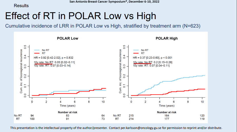 POLAR是第一个基因组分类器,它不仅可以预测LRR,还可以预测RT和分类器之间存在显著的相互作用。POLAR评分高的患者应推荐放疗,而低评分的患者则推荐保乳手术后豁免放疗。