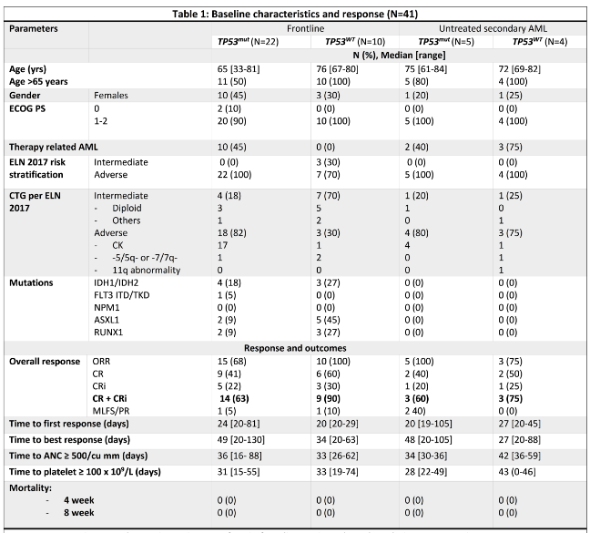 从2020年8月~2022年6月1日,入组了74例患者,其中41例为新诊断AML(ND-AML),另外4例为既往接受低甲基化药物(HMA)治疗后继发性新诊断AML(ND-AML),29例为复发/难治性AML(12例既往未接受venetoclax,17例接受了venetoclax治疗)。患者的基线特征以及基于TP53突变的缓解率(表1),其中41例新诊断(ND-AML)的患者中绝大多数为高危:93%(38/41)具有不良预后因素,包括不良的细胞遗传学(29/41)及治疗相关性AML(15/41)。