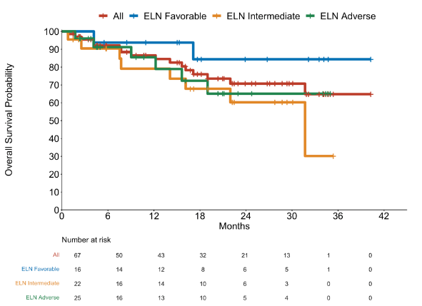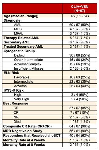第二项研究(摘要709)同样是美国MD Anderson癌症中心开展的II期试验,研究对象为相对年轻的新诊断AML(ND-AML)或高危MDS患者,核心宗旨在于通过强化化疗(CLIA方案)联合维奈克拉(VEN)使患者达到MRD高阴性率,进而改善患者的长期生存或使这部分患者尽快接受移植。该研究中应用CLIA方案作为强化化疗,在此基础上联合维奈克拉(VEN)进行治疗,而应用维奈克拉的时间并不长(仅1周),venetoclax 400mg d2~d8,没有剂量爬坡,希望通过短疗程的早期集中治疗,联合化疗及靶向治疗进而实现高的MRD阴性率,另外对于FLT3突变的患者中允许使用FLT-3抑制剂。该研究共纳入了67例患者,其中60例为AML,4例为高危MDS,另有3例为混合表型急性白血病(MPAL)患者,根据ELN危险度分层,该研究中低危患者占25%,中危占35%,高危占40%,患者分布相对比较均匀,另外66%患者为正常的二倍体染色体核型,这也是符合AML患者群体的总体特征。主要的研究终点为CRc(即CR+CRi),次要终点为OS、EFS及ORR。