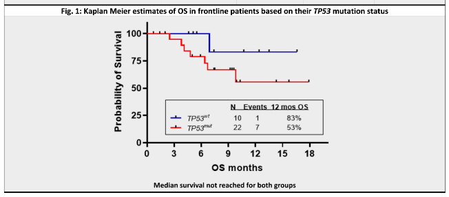 在新诊断AML(ND-AML)患者中:①总体缓解率(ORR)达到了80%(33/41),其中27例TP53突变的AML患者中ORR达到74%,CR/CRi为63%,CR则为41%;而14例TP53突变野生型患者的ORR则为93%,CR/CRi达到86%,CR则达57%。②对于32例非继发性ND-AML患者,中位随访9.2个月,结果显示,中位OS尚未达到(无论TP53突变型或野生型),1年OS分别为为53%(TP53突变型)及83%(TP53突变野生型),中位缓解持续时间(mDOR)则依次7.4个月及未达到(NR)(图1)。③对于9例继发性的初治AML患者,中位随访17.5个月,中位DOR和OS分别为6.5个月、7.2个月。