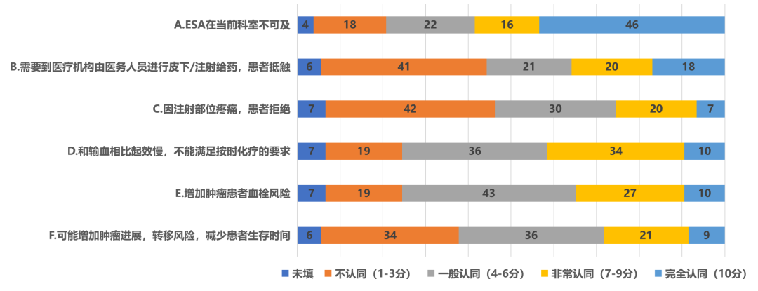 在327份有效问卷中,有32.4%(n=106)的受访者所在科室从未使用ESA进行CIA治疗。在这106份有效问卷中,认为造成未使用ESA纠正贫血的主要原因(注:本次调研中的观点排序是根据选项得分、问卷总数和总得分进行权重排序的)是:“ESA在当前科室不可及”、“和输血相比起效慢,不能满足按时化疗的要求”、“增加肿瘤患者血栓风险”。三甲医院受访者非常认同“ESA在当前科室不可及”的比例低于其他级别医院(38%vs 50%);而非常认同“和输血相比起效慢,不能满足按时化疗的要求”的比例高于其他级别医院(34%vs 29%)。