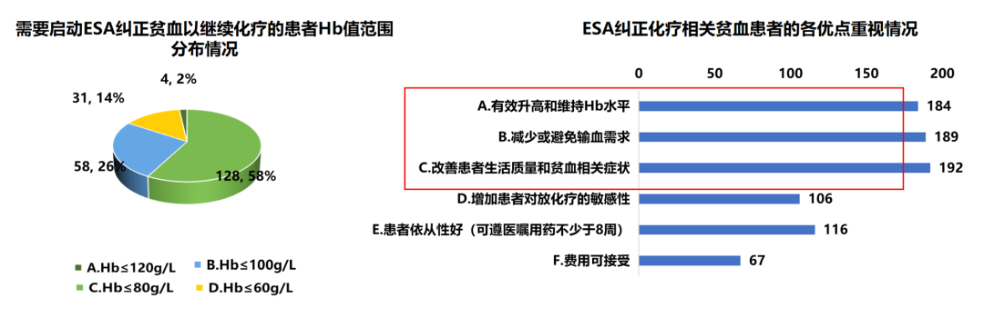 图7.整体分析中受访者认为需要纠正贫血的Hb值范围及ESA纠正贫血的优点