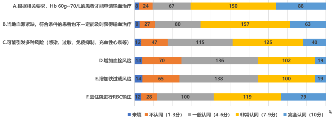 在331份使用输血的有效问卷中,受访者认为输血纠正贫血所面临的主要挑战是:“根据相关要求,Hb 60g~70/L的患者才能申请输血治疗”、“当地血源紧缺,符合条件的患者也不一定能及时获得输血治疗”、“需住院进行RBC输注”。三甲医院、其他级别医院对此问题的观点分布于整体人群一致。
