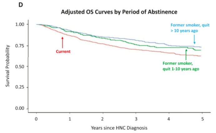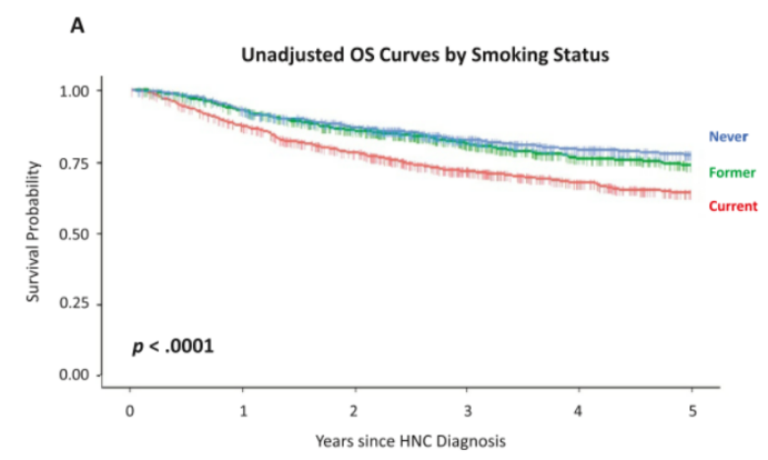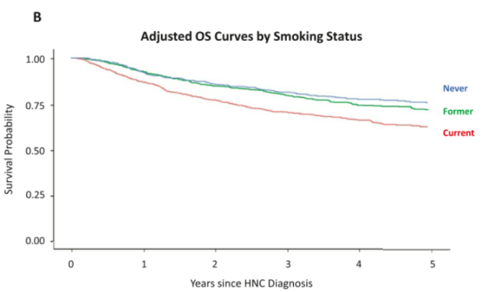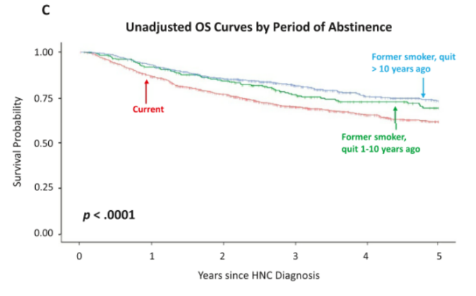 编者按:近日,根据Cancer上发表的一项研究结果,戒烟时间>10年与头颈部鳞状细胞癌(HNSCC)患者的总体死亡率及HNSCC特异性死亡率降低显著相关。