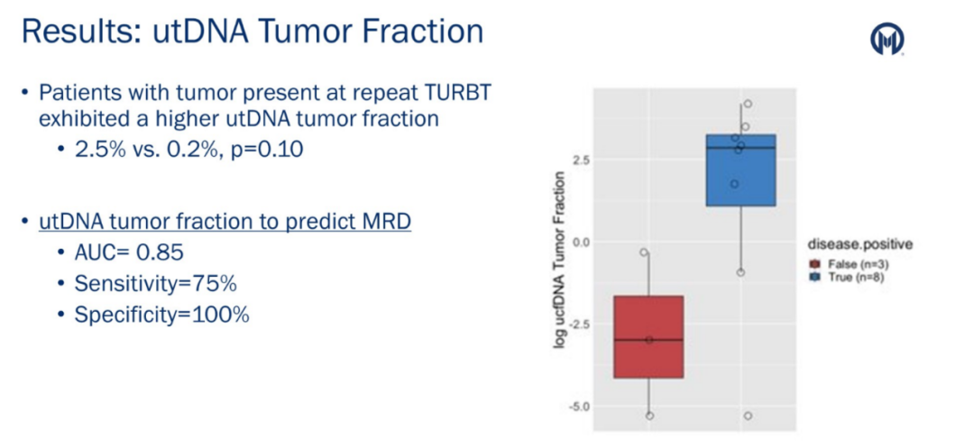 总体而言,50%的utDNA突变与指标肿瘤组织一致,39%与rTURBT组织一致,33%三者均一致。二次电切术中有可见肿瘤的患者,显示出更高的utDNA肿瘤分数(2.5%vs 0.2%,P=0.10)。utDNA分数用于预测MRD的受试者工作曲线下面积(AUC)为0.85,敏感性为75%,特异性为100%。