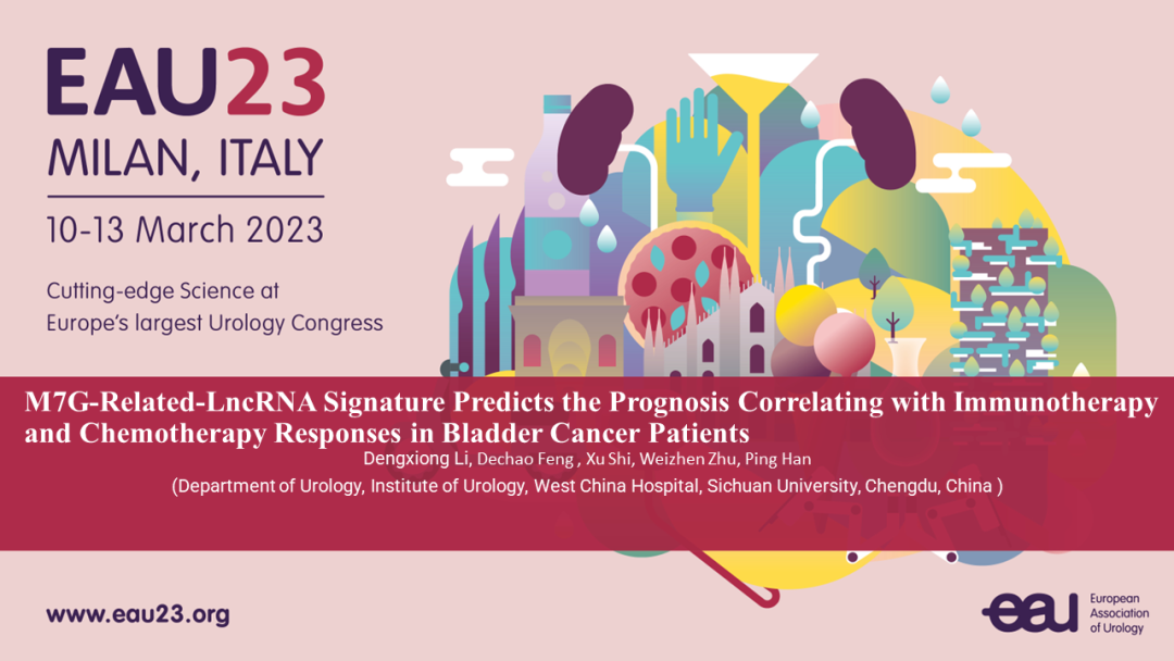 第38届欧洲泌尿外科学会年会(EAU23)于2023年3月10日至13日在世界时尚之都意大利米兰召开。EAU年会是欧洲乃至全球最受关注的泌尿外科会议之一,每年吸引全球1万5千余名泌尿外科专家参会。本次大会上,四川大学华西医院李登雄医生汇报的一项研究表明,N7-甲基鸟苷(m7G)相关的长链非编码RNA(lncRNA)预后指数(MRLS)可用于预测膀胱癌患者的预后、免疫治疗和化疗反应,有望提供一种新的膀胱癌生物标志物。