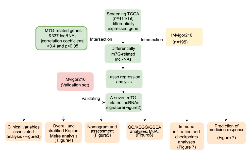 我们从TCGA中提取BC和正常样本的RNA-seq和相应的临床数据。M7G相关的lncRNA预后指数(MRLS)由lasso回归模型构建,并由Kaplan-Meier曲线、相关性分析、单变量和多变量Cox回归模型验证其临床相关性和预后能力。根据高低MRLS的中位数,将患者分为高低MRLS组。相关性分析和CIBERSORTx分析用于评估免疫检查点和免疫浸润在高低MRLS组患者的差别。癌症免疫组数据库(TCIA)和癌症药物敏感性基因组学分别用于预测高低MRLS组患者的免疫疗法和化疗反应。具体的工作流程如下图1。