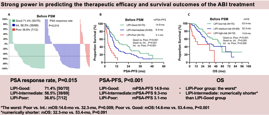 这项研究的结果显示:在转移性激素敏感性前列腺癌中,LIPI好、中以及差三组患者的无去势抵抗性前列腺癌生存期(CFS)和总生存期(OS)逐渐缩短;而对于接受阿比特龙一线治疗的去势抵抗性前列腺癌患者,LIPI分组同样显示出了预后的差异,LIPI好、中以及差三组患者的前列腺特异性抗原(PSA)反应率、无PSA进展时间以及总生存期都呈现出逐步递减的趋势。总结结果,LIPI对于转移性激素敏感性和去势抵抗性前列腺癌都具有很好的预后价值。