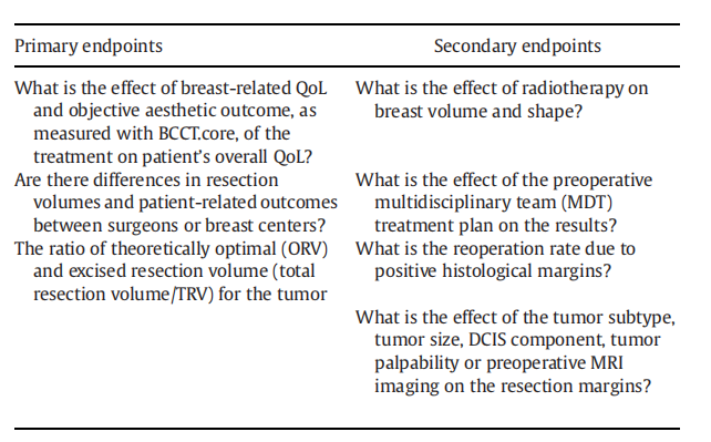 主要研究终点:1、乳腺相关的QoL和客观美学评分(由BCCT.core计算)对于患者整体QoL的影响?2、不同的乳腺中心和医生对于切除体积和其导致的生存结局是否存在差异?3、ORV/TRV的比例。