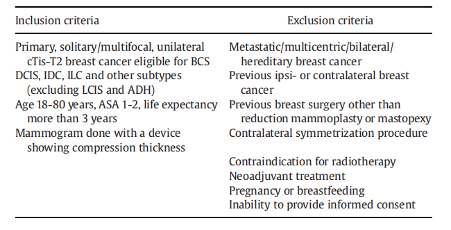 纳入患者纳入标准:原发,独立或多灶的,单侧cTis-T2,可进行BCS的患者;DCIS,IDC,ILC和其他类型(排除LCIS和ADH);年龄18-80岁,ASA 1-2,预期寿命超过三年;乳房X线检查结果显示厚度。