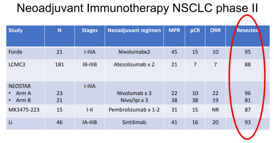 Dr.Smit选择的几项II期新辅助免疫治疗试验中的手术患者数据
