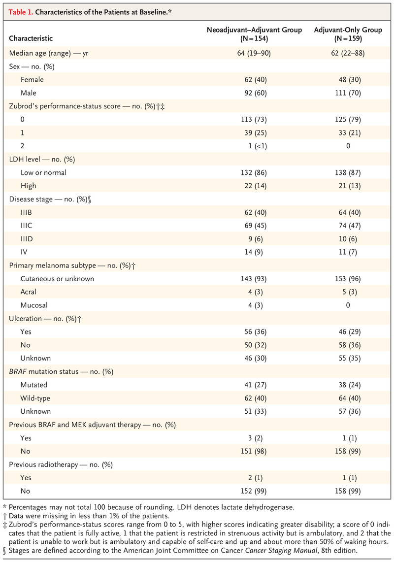 研究纳入了313例符合条件的黑色素瘤患者,其中154例患者被分配至新辅助-辅助治疗组,159例在单纯辅助治疗组。经过14.7个月的中位随访期,共有105例事件发生,其中新辅助-辅助治疗组38例,辅助治疗组67例。相较于单纯辅助治疗组,新辅助-辅助治疗组的EFS显著延长(HR 0.58,95%CI 0.39–0.87;P=0.004);新辅助-辅助治疗组患者的2年EFS率为72%(95%CI:64%-80%),单纯辅助治疗组为49%(95%CI:41%-59%)。在接受新辅助治疗的可评估患者中,分别有6%和41%达到CR和PR;当地机构病理学评估的pCR为21%;大多数患者(127/144,88%)接受了根治性手术。安全性方面,新辅助-辅助治疗组3级及以上相关不良事件发生率为12%,单纯辅助治疗组为14%,且没有发现新的毒性。