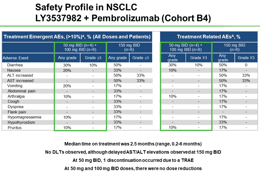 LY3537982单药:未观察到剂量限制性毒性(DLT)。在所有剂量水平组,任何级别的治疗中发生的不良事件(TEAE)包括腹泻(36%)、疲劳(17%)、便秘(16%)、恶心(16%)和天冬氨酸转氨酶升高(AST;12%),大多是1级事件,以上几种TEAE分别有6%、2%、1%、1%和1%为2级;1例3级AST和1例4级腹泻归因于CT扫描中的造影剂不耐受。任何级别的治疗相关AE(TRAES)如下:腹泻(25%)、疲劳(8%)、便秘(5%)、恶心(10%)和AST升高(7%)。Murciano-Goroff说:“总的来说,LY3537982单药治疗可耐受,由于药物相关的不良事件(AE)而减量或永久停药的情况很少发生(各有1例)。有趣的是,在单药治疗队列中有7例患者之前接受KRAS G12C抑制剂治疗因毒性停药,在本试验中只发生≤2级TEAE,至数据截止时,所有7例患者仍在接受治疗。”