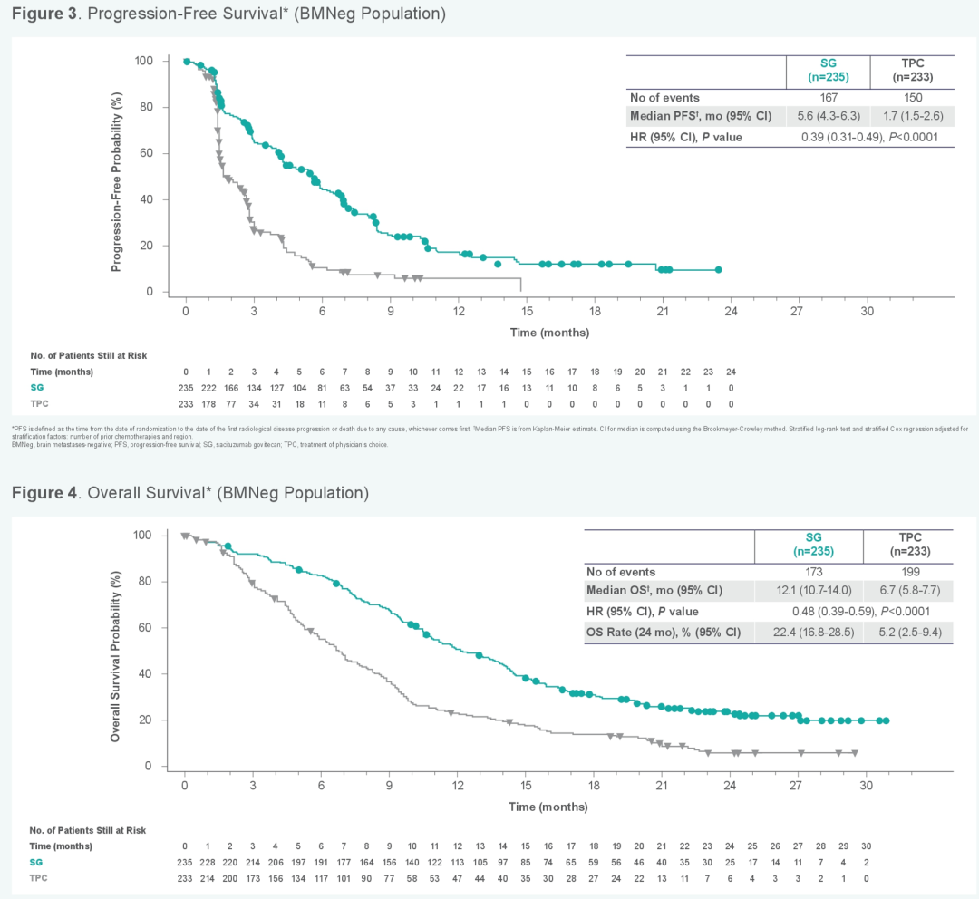 SG在TNBC的应用广泛受到国内外指南的推荐主要源于ASCENT研究以及中国医学科学院肿瘤医院徐兵河院士牵头的EVER-132-001桥接研究。ASCENT研究是一项国际多中心、随机、对照、Ⅲ期临床研究。该研究纳入了529例紫杉类经治后进展的mTNBC患者,其中468例患者无脑转移,为主要分析人群,在按1:1随机分组后分别予以SG以及医生选择的治疗方案(TPC,包括卡培他滨、艾立布林、长春瑞滨或吉西他滨等),直至疾病进展。最终疗效分析显示,对于无脑转患者,SG提升中位无进展生存期(mPFS)3倍以上(5.6 vs 1.7个月,HR 0.39,95%CI:0.31~0.49,P<0.001);中位总生存期(mOS)延长至接近2倍(12.1 vs 6.7个月,HR 0.48,95%CI:0.38~0.59,P<0.0001),24个月OS率22.4%vs 5.2%[5];客观缓解率(ORR)则提高至7倍(35%vs 5%)[6],且事后分析显示无论Trop-2表达水平高低,患者均可从SG治疗中取得获益[7],基线Trop-2表达水平与临床反应程度无相关性[8]。