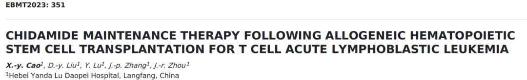 Allo-HSCT后的复发是T-ALL患者面临的主要挑战。在T-ALL中,表观遗传学异常很常见,组蛋白去乙酰化酶(HDAC)1和HDAC4在T-ALL患者的肿瘤细胞中与正常骨髓样本比较经常呈过度表达。西达本胺(Chidamide)是一种HDAC抑制剂,不仅具有抗肿瘤活性,且能够增强免疫细胞介导的抗肿瘤细胞的细胞毒性,该药已于2014年在中国获批上市。因此,西达本胺有可能通过移植物抗白血病作用来降低T-ALL在allo-HSCT后的复发率。我们通过该项研究探讨了T-ALL患者在allo-HSCT后,采用西达本胺维持治疗的安全性和有效性,希望通过降低T-ALL患者移植后的复发来提高生存率。