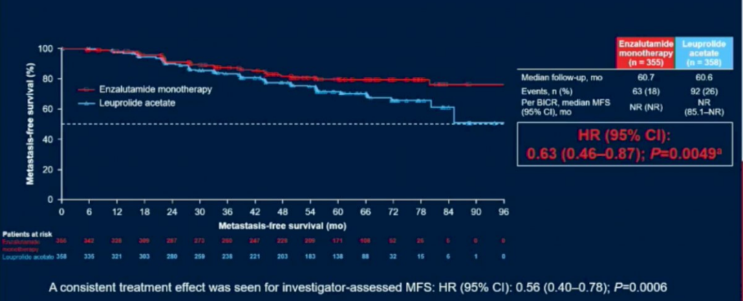 恩扎卢胺单药治疗组的MFS事件风险相较于亮丙瑞林组降低37%(HR 0.63,95%CI:0.46~0.87,P=0.0049)。