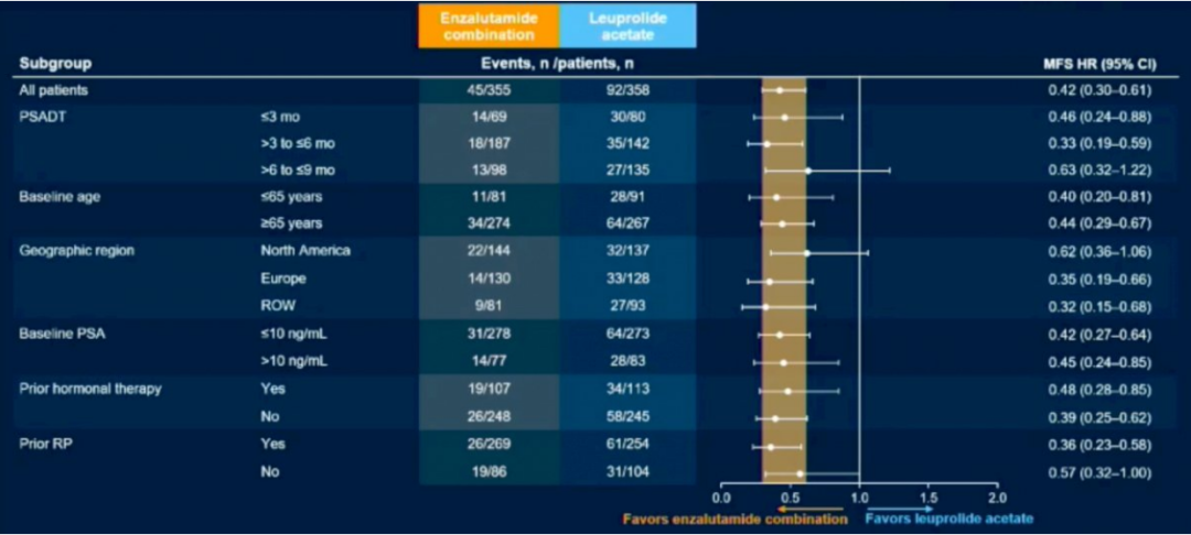 中位随访5年,恩扎卢胺联合组相较于亮丙瑞林组的MFS事件风险显著降低58%(NR vs NR;HR 0.42,95%CI:0.31~0.61,P<0.0001)。亚组分析显示,无论PSADT、基线年龄、PSA、地理区域、既往接受内分泌治疗或既往RP,恩扎卢胺联合亮丙瑞林治疗组均有一致获益。